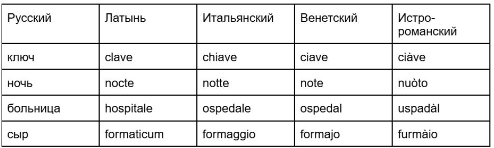 Вот некоторые соответствия слов на латинском, итальянском, венетском и истророманском: