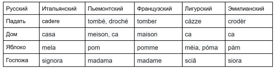 Ещё один северный диалект (или, скорее, группа диалектов), распространённых в тех же регионах, как и вышеперечисленные. Вот некоторые соответствия слов на итальянском, пьемонтском, лигурском и эмилианском, а также французском, поскольку с ним в этих языках (диалектах) тоже много общего.