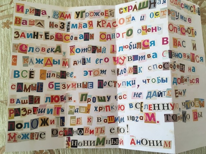 P.S. Для тех, кто не в курсе в стародавние времена, когда ещё не было этих ваших интернетов и электронных писем, для написания анонимных писем использовали буквы, слова, строчки и т.д. вырезанные из газет. Например, в фильме "Безжалостные люди" 1986 г. это было в сюжете. Таким образом можно было сохранить анонимность в письмах с угрозами, так как почерковедческая экспертиза могла вывести преступника на чистую воду, даже если он писал письмо левой ногой и печатными буквами.