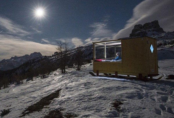 Среди живописных Доломитовых Альп на высоте 2055 метров над уровнем моря появился необычный вагончик на санках. Это новый аттракцион для романтиков, решивших полюбоваться звездным небом. Воспользовавшись крошечной кабинкой, можно провести ночь на природе в довольно комфортных условиях.