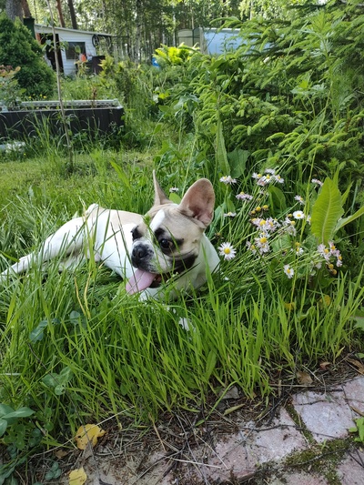 12 Goryanova Ромашки 3 года назад Втягиваем ромашку, вытягиваем уши. [моё] Французский бульдог Собака Лето Ещё 0