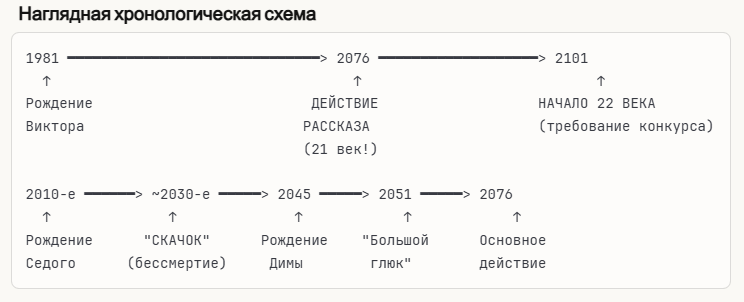 Следовательно, действие рассказа происходит в 2076 году. Это точно 22 век? Это не интерпретация, не вопрос художественного прочтения. Это прямое несоответствие заявленным техническим требованиям конкурса.