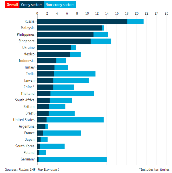 Россия заняла первое место в мире по значению «кумовского капитализма» для экономики, свидетельствует рейтинг, составленный журналом The Economist. В первую пятерку также попали Филиппины, Сингапур, Малайзия и Украина.