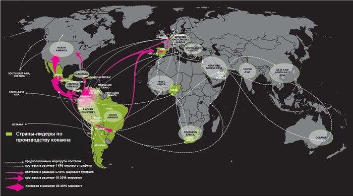 Один из главных мировых маршрутов кокаина ведет в Россию: Южная Америка — Мексика — Атлантика — Африка — Прибалтика — РФ.