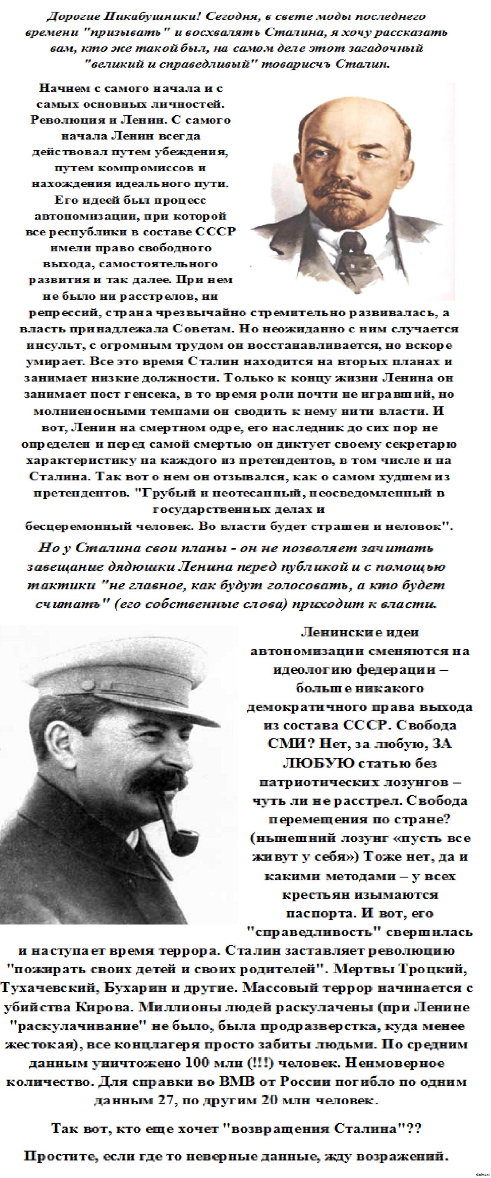 nassit1228 Россияне, одумайтесь! Зачем нам такое счастье ОПЯТЬ? 12 лет назад Длиннопост. Коммент для минусов внутри. Походу, я рукожоп - получилось немного криво)) [моё] Ленин Сталин Длиннопост