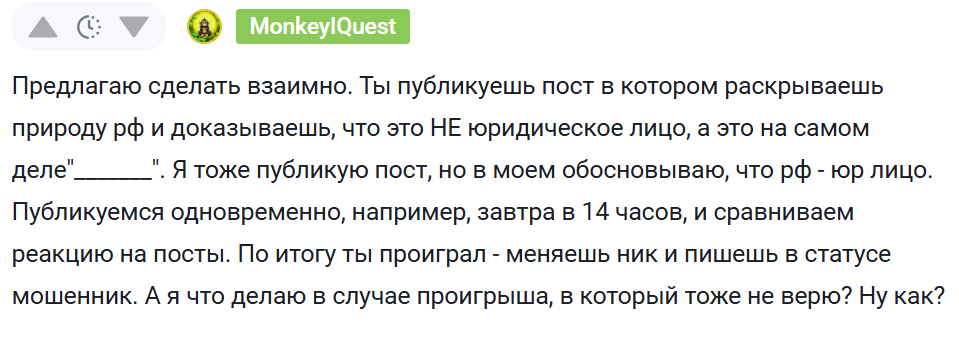 Ждем поста от @MonkeyIQuest, где она будет объяснять, почему Российская Федерация - это юридическое лицо.