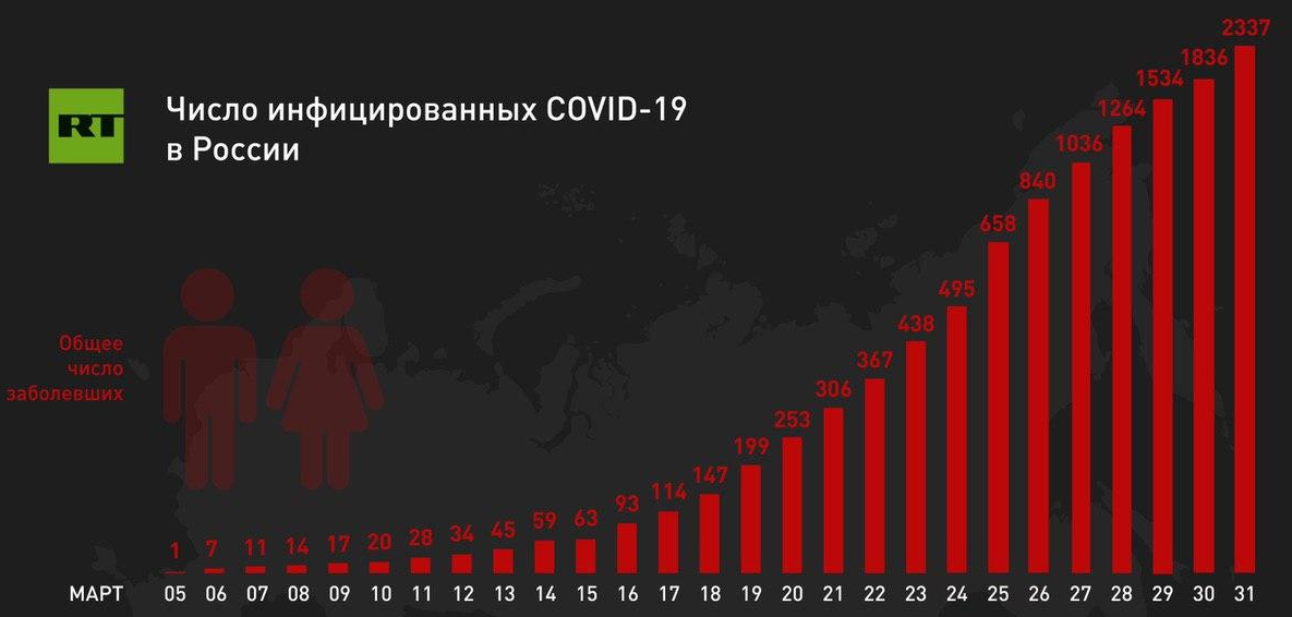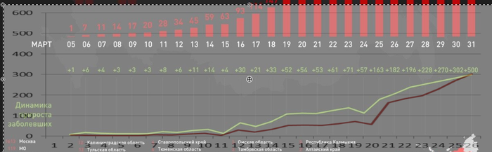 Кажется, всё в порядке, и заболеваемость пошла на спад? Но нет, не всё так просто. Посмотрите на числа. 24 марта мы видим, что заболевших было 495 человек, и на графике это примерно половина. А 31 марта - 2337 человек, в 4,7 раза больше. Виден ли на графике рост почти в 5 раз? Видно ли на графике, что рост 30-31 марта (501 человек) втрое больше, чем 24-25 марта (163 человека) Вопрос риторический.