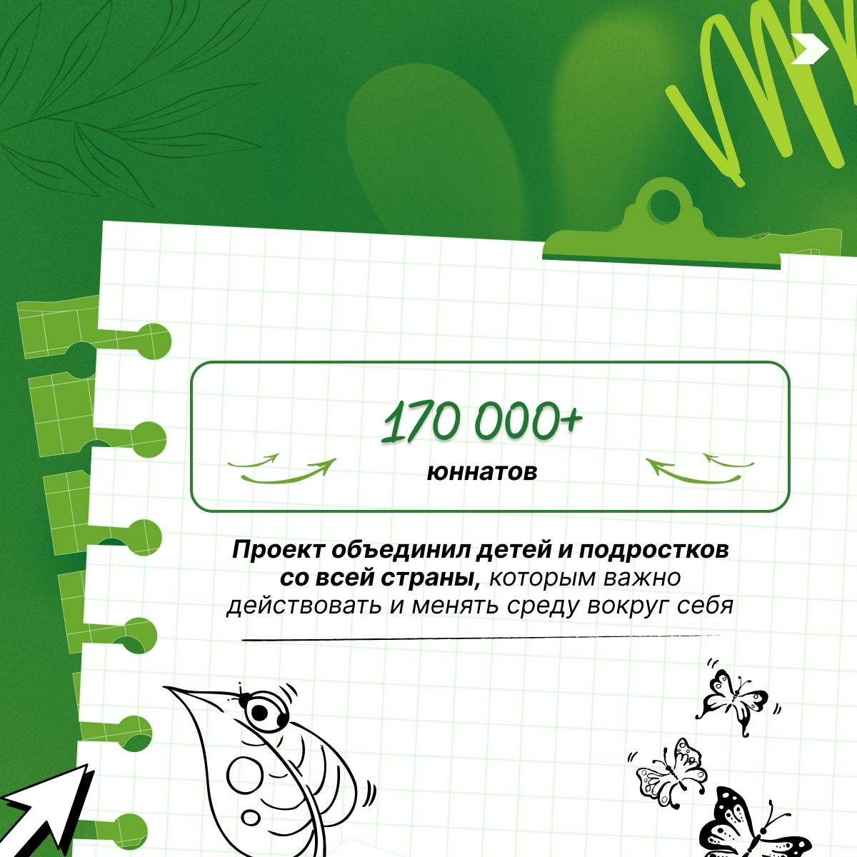 По итогам 2025 года в движение юннатов уже влились более 170 тысяч ребят. Организовано 10 тыс. событий. Появилось 1500 новых клубов юных натуралистов (всего их уже более 9 тыс.). На слёте Юннатов Первых в Мурманской области создана уникальная интерактивная экологическая тропа.