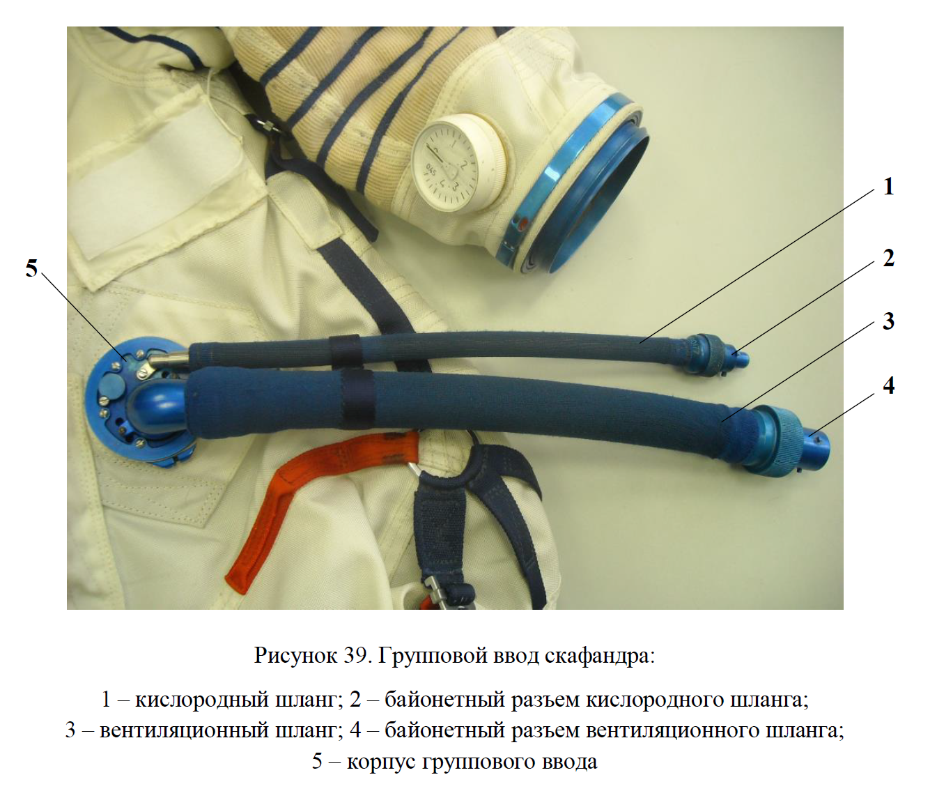 В кислородном шланге 1 на входе в групповой ввод установлена дюза, дозирующая расход кислорода в скафандр в пределах 22 л/мин.