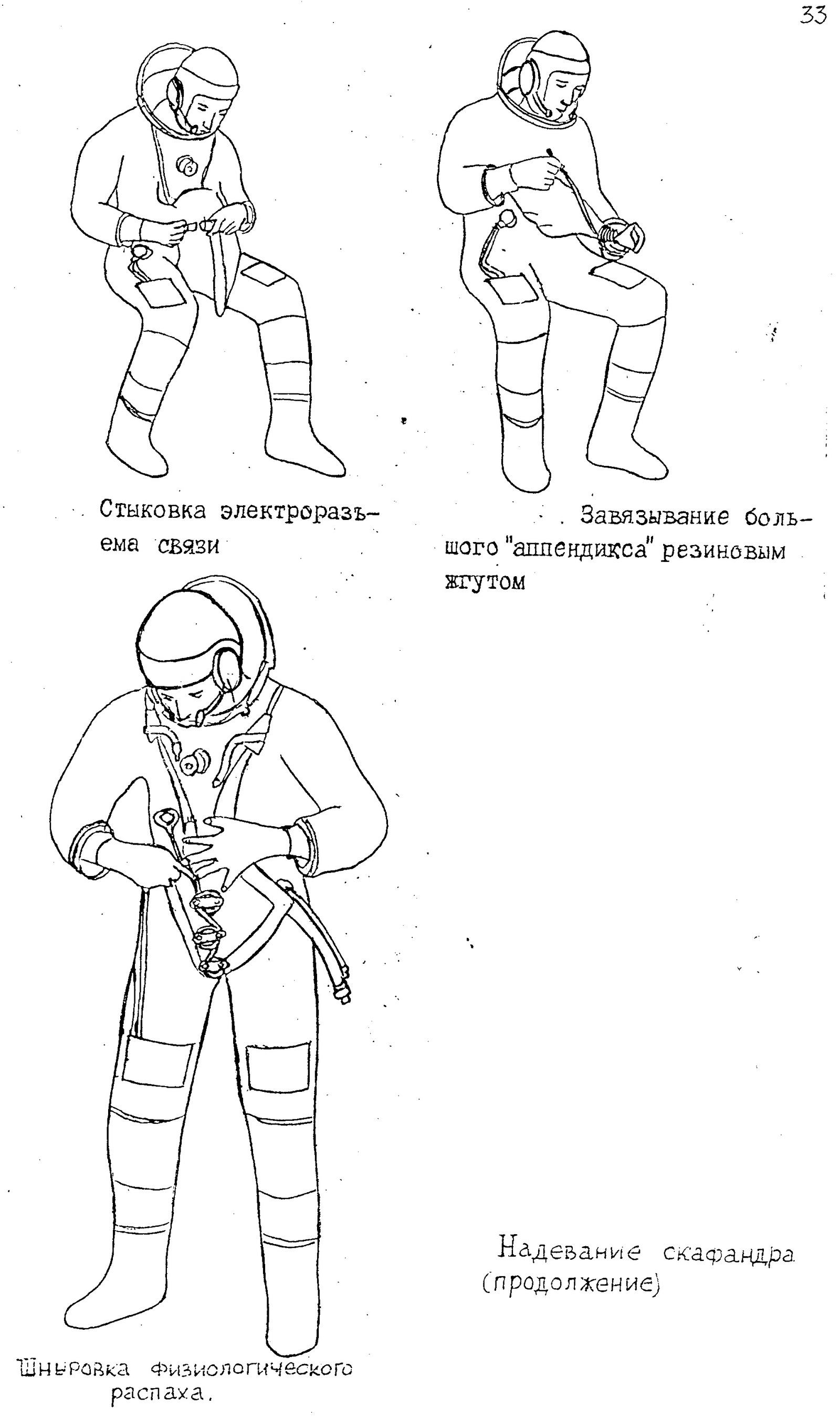 - состыковать электроразъёмы шлемофона и медицинского пояса с внутренними электроразъёмами скафандра, уложить их в карман внутри скафандра;
