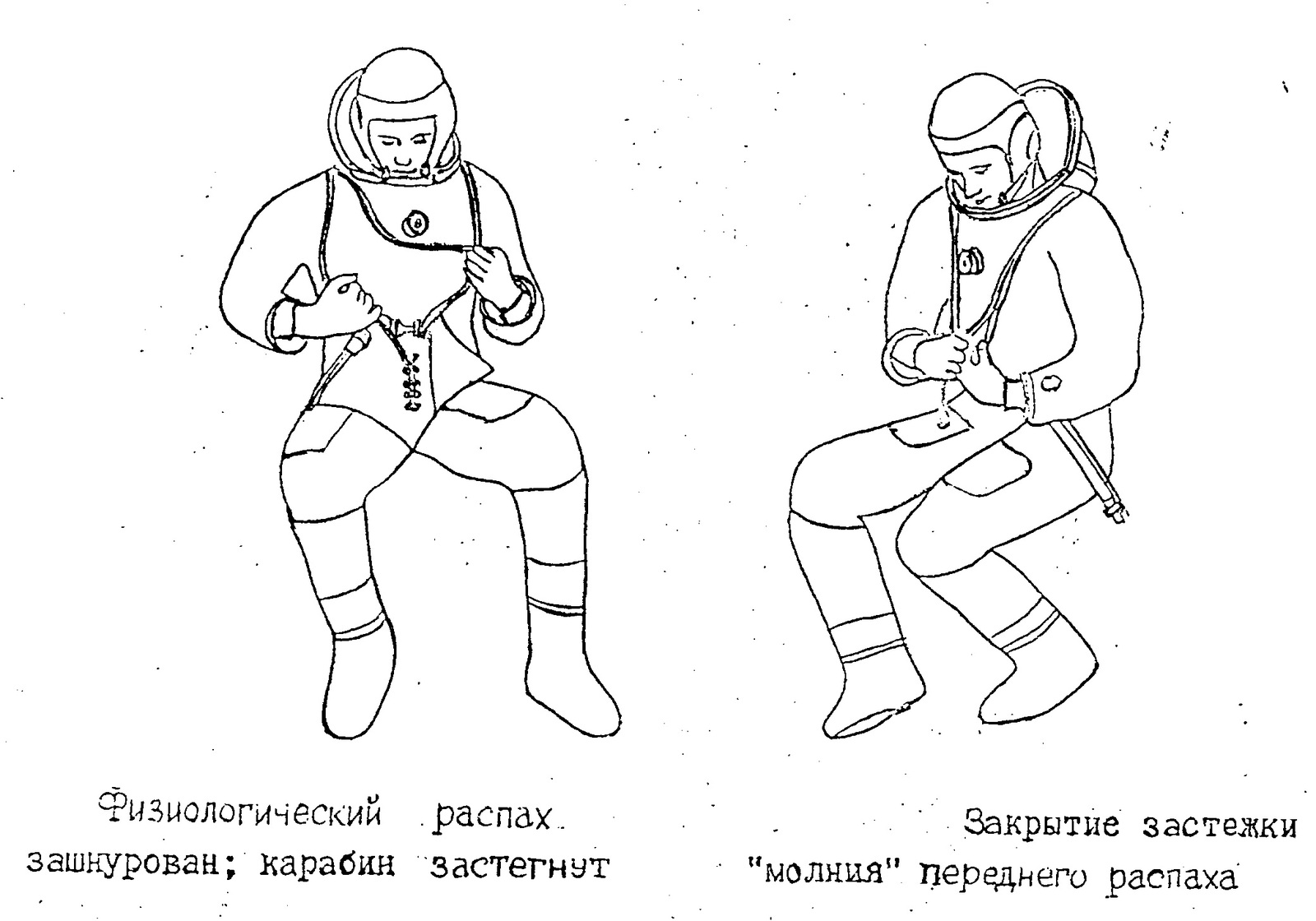 Перед надеванием скафандра в полете необходимо произвести его внешний осмотр и убедиться, что регулировочные ленты подтяга ног (ленты подгонки длины бедра и голени) распущены.