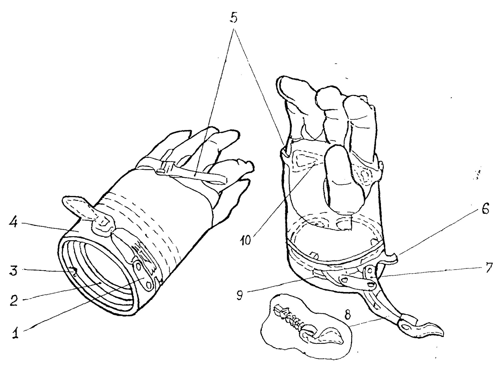 Для сохранения под избыточным давлением формы ладони руки на силовую оболочку гермоперчатки в ладонной части надето стальное проволочное полукольцо.