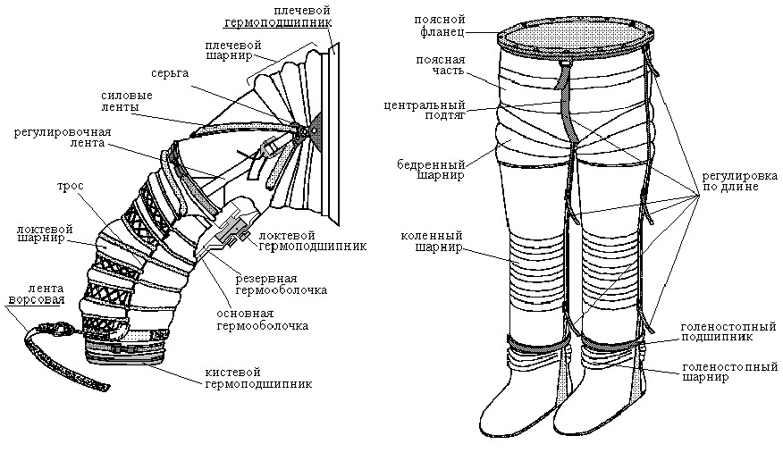 Силовые ленты оболочек ног с пряжками подтяга, расположенными по нейтральным осям шарниров, воспринимают продольные нагрузки от избыточного давления и позволяют осуществлять регулировку скафандра по росту.
