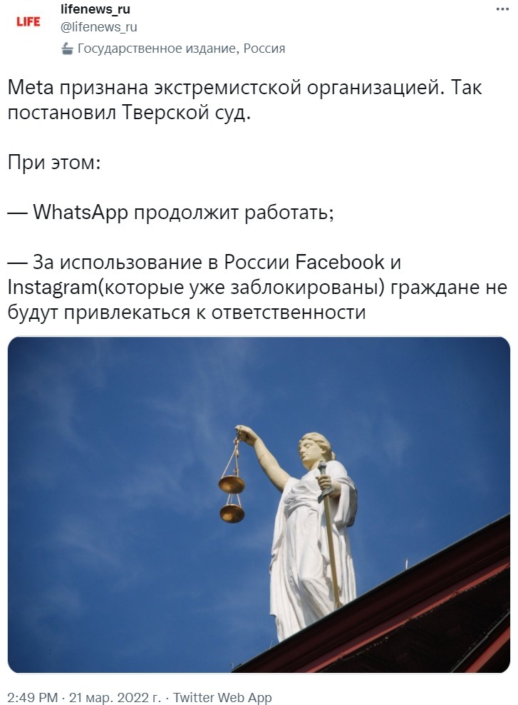 Решение о запрете деятельности Meta в России вступает в силу немедленно — суд