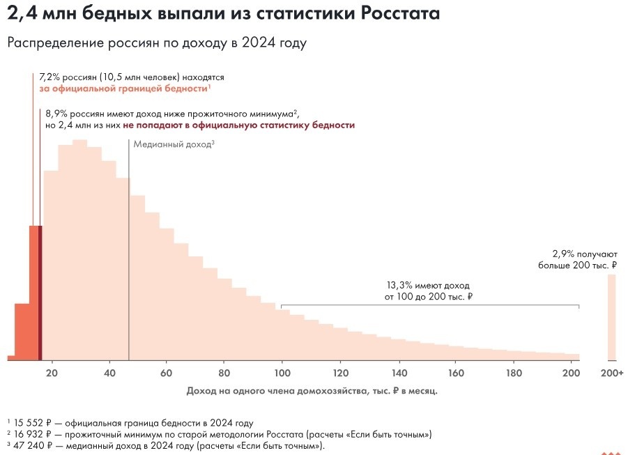 Методика подсчета изменилась. Еще до 2021 года бедными считались те, чей доход был ниже прожиточного минимума — такого себе официального минимального ценника на жизнь: еда, коммуналка, базовые услуги. Потом придумали считать по-другому — через медианный доход. Если точнее, бедными стали называть тех, чьи доходы не дотягивали до 44,2% от медианы. Но недолго музыка играла: в том же году методику поменяли снова.