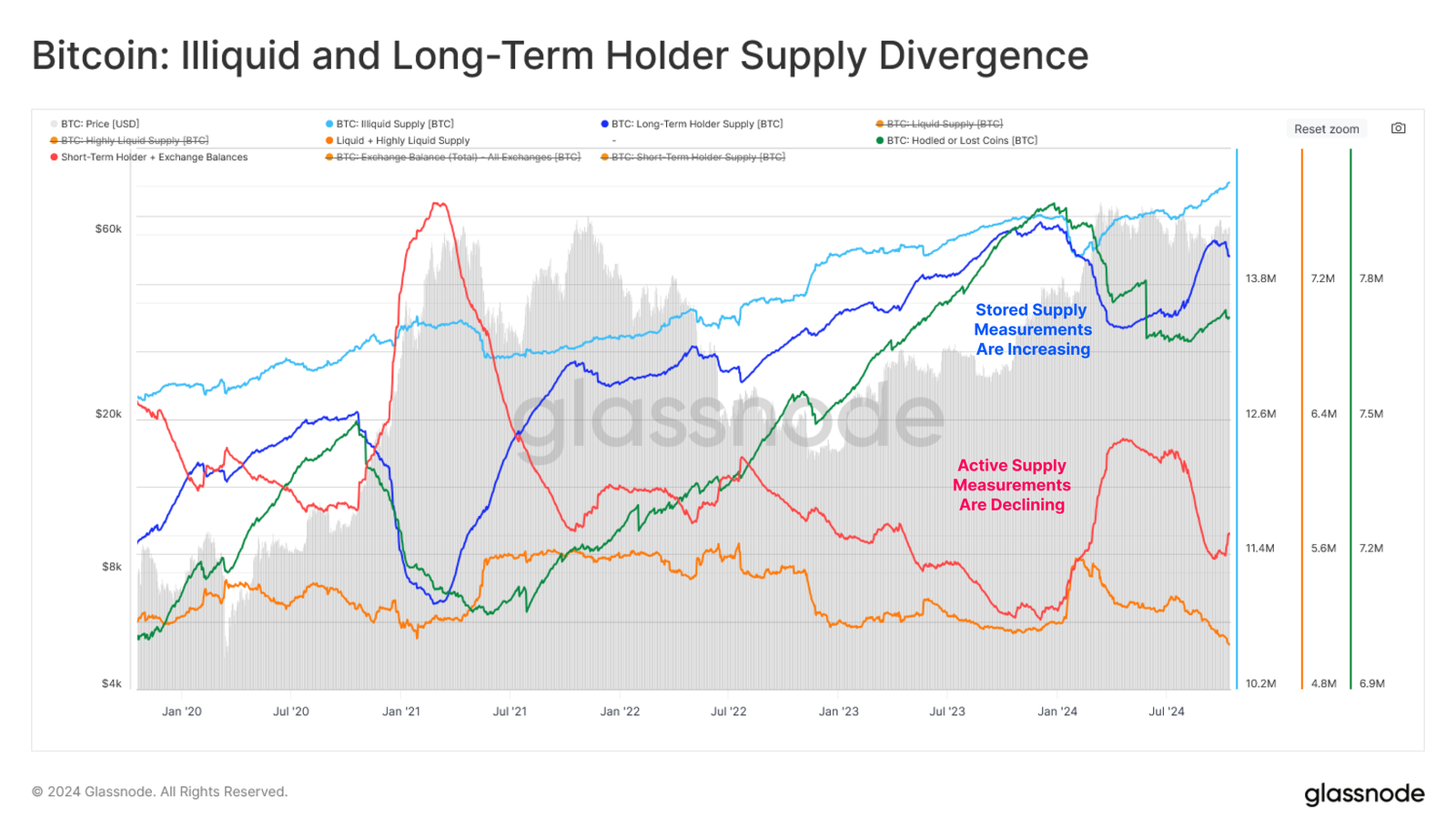 С середины лета доступное предложение резко сократилось, что нашло отражение в росте баланса долгосрочных держателей.
