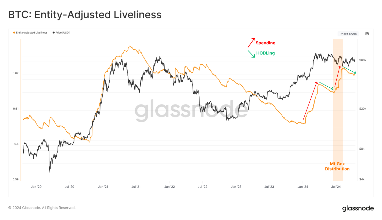 Более наглядно совокупность представленных кривых отражает индикатор накопления «Liveliness», который ведет подсчет времени покоя монет по отношению к оборотному предложению (подробнее здесь). Во время распределения монет бывшим клиентам Mt.Gox график закономерно рос, однако затем сеть вернулась к режиму накопления.