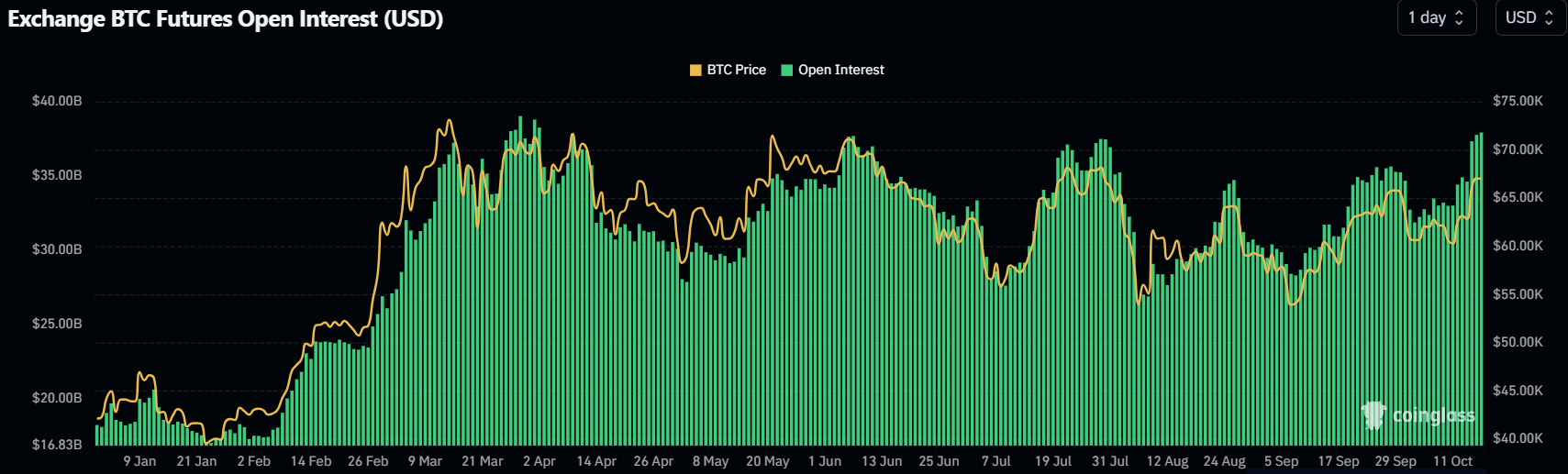 Во-вторых, открытый интерес к Bitcoin на фьючерсном рынке приблизился к рекордным $39 млрд, достигнутым 29 марта.