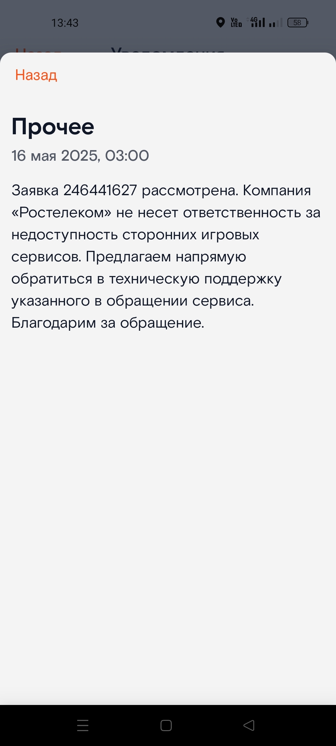 0 kexas Ростелеком 6 месяцев назад Играл в игру в приложении мой Ростелеком 5 марта возникла проблема невозможно зайти в локацию игры без этого невозможно прохождение игры отправил заявку в чат поддержки меня там промурыжили 2 месяца потом получил такой ответ [моё] Интернет Ростелеком Длиннопост Ещё 0