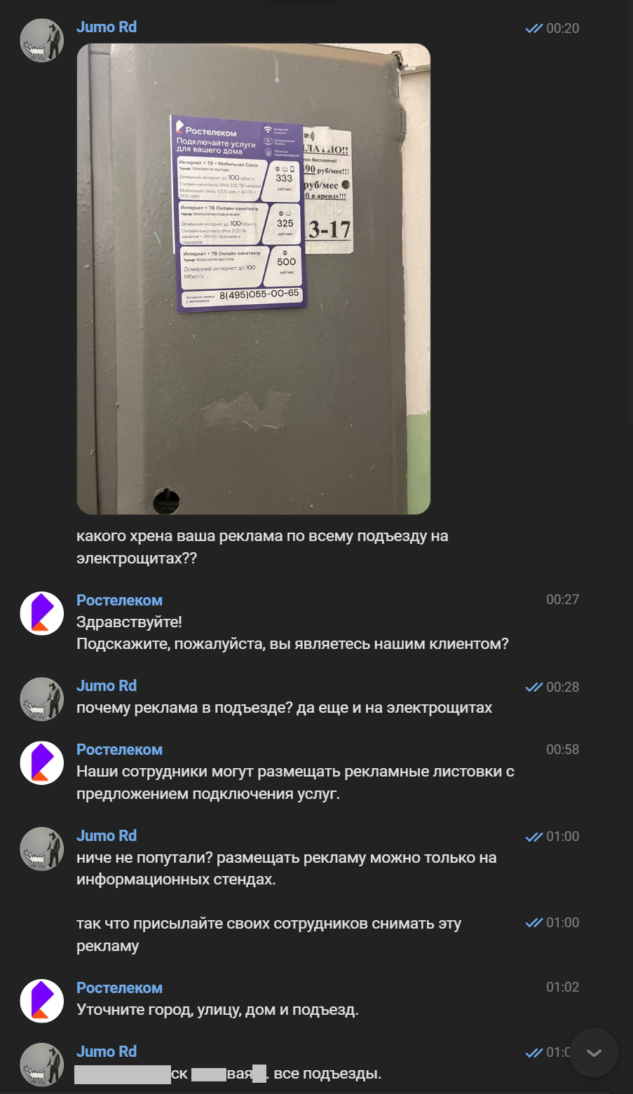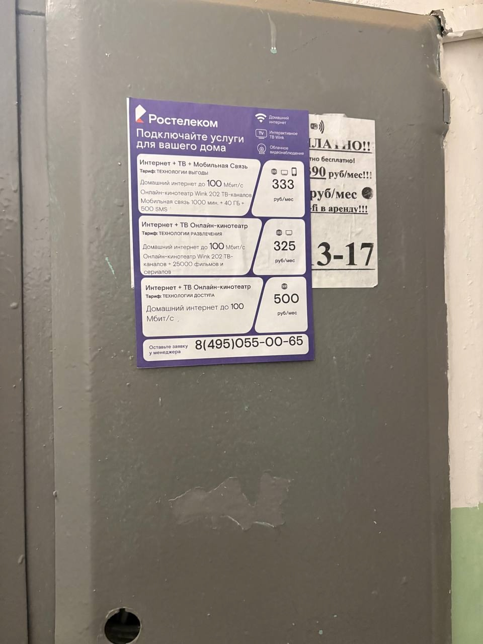 Приехав домой в пятницу замечаю, как ростелеком в очередной раз насрал в подъезде. Рекламные объявления сунули чуть ли ни в каждую щель - в информационный стенд поверх контактов управляющей компании, в каждый почтовый ящик, налепили на стенах и на электрощитах.