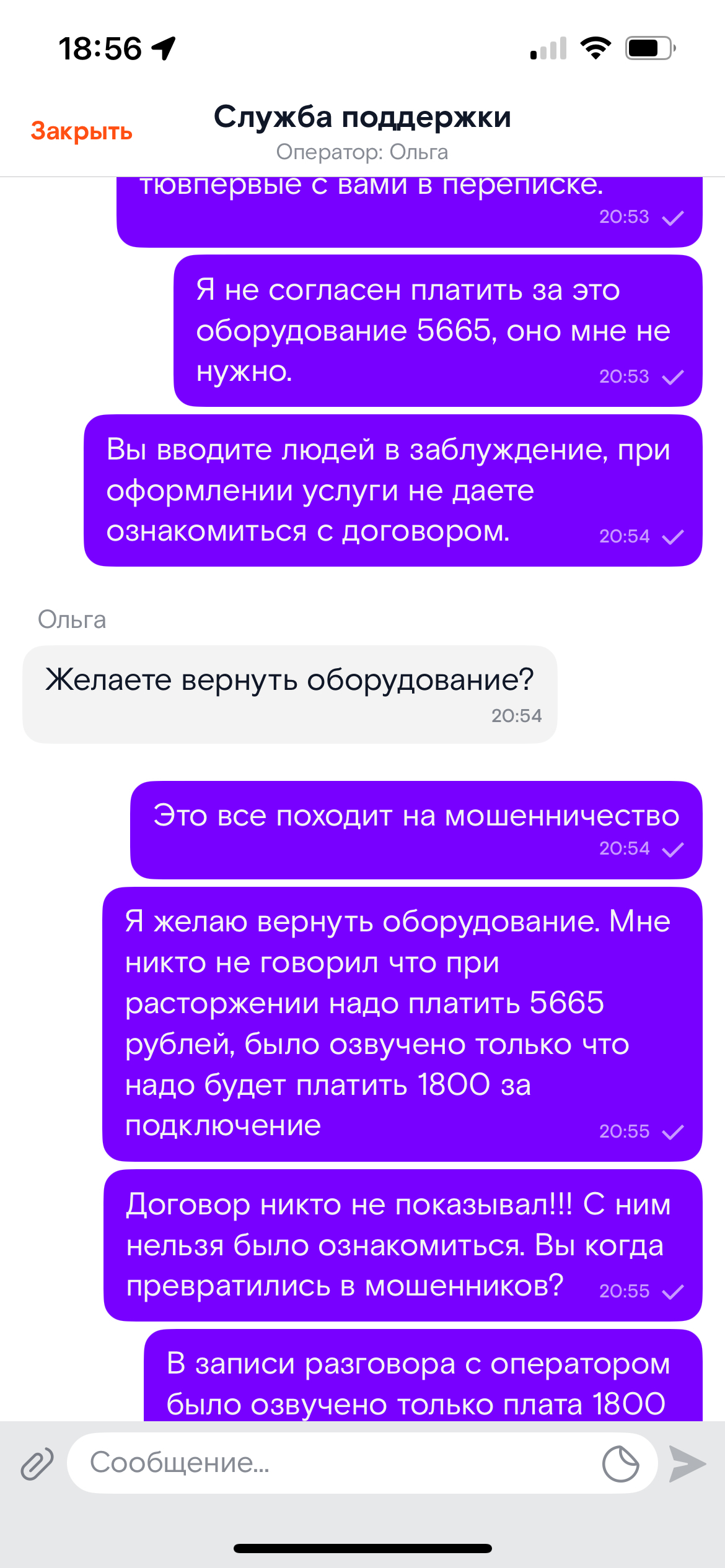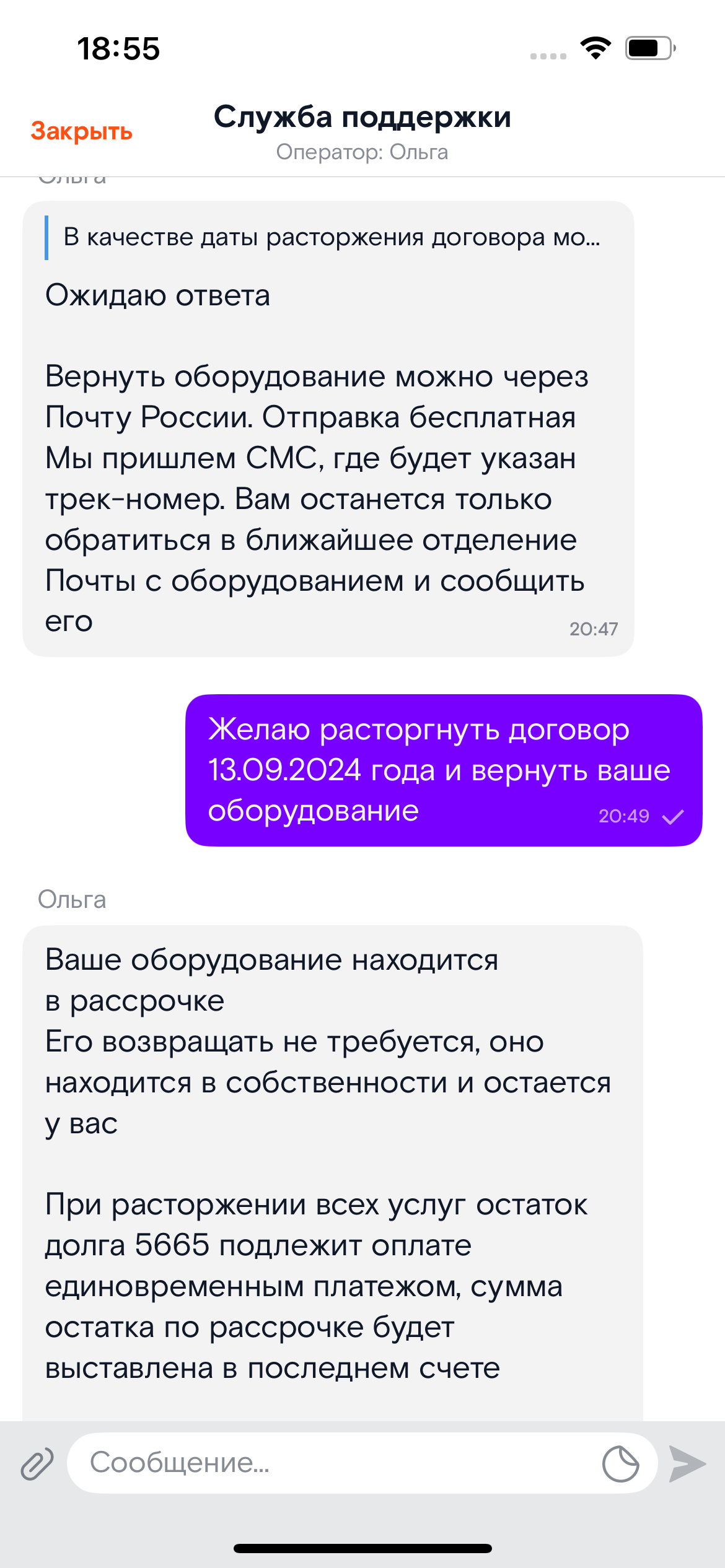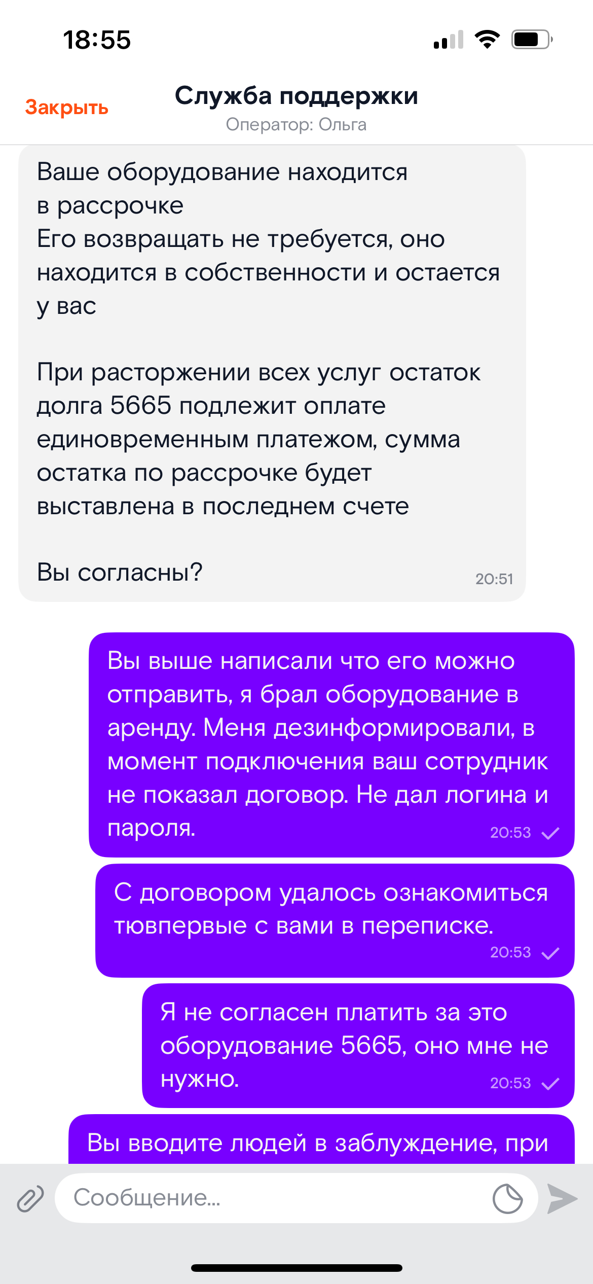 Поняли на сколько убогая компания иирешили расторгнуть договор, теперь они требуют еще 6000 рублей за оборудование и не хотят забирать оборудованип назад. Вы совсем там охренели? Похоже на разводы с автосалонами.