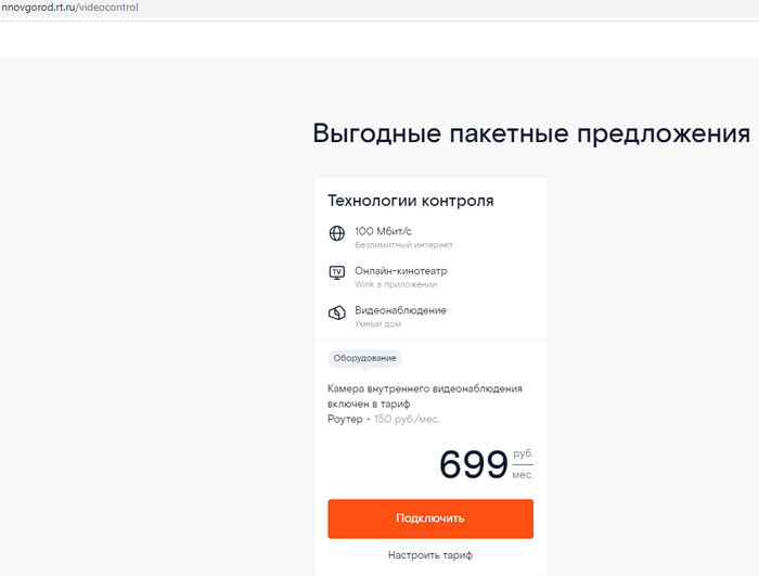 Подключение пакета "Технологии контроля", подключение бесплатное, 100Мбит, 700р в месяц, внутренняя камера которая входит в стоимость тарифа.