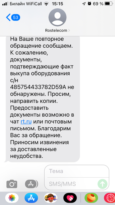 Дорогие соотечественники! В эту не очень простую годину обращаюсь к вам с одним вопросом- есть ли среди вас пострадавшие от произвола ростелекома? В частности от счетов за аренду оборудования, которое уже длительное время находится у вас и о боже!!!!- согласно акта приёма-передачи является вашей собственностью!!!! Естессно тормоза в службе одного окна не в курсе,игнор номера полнейший , при попытке прозвона с другого номера игнор после сообщения номера лицевого счёта. Любая заявка в лк заканчивается высылом на почту всей документации но не пониманием процесса. Думаю наверное только суд может их остановить, досудебка по любому пойдет в чат . сумма в 30 рублей выставляется с мая. понимаю что копейки , но в рамках родины и умножить на время то можно через год купить Чад.