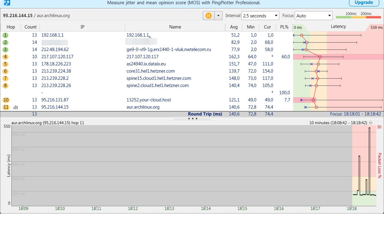Замер скорости можете выполнить на сайте qms.ru. Мы со своей стороны предоставляем доступ к интернет сети, а не конкретно к определенным ресурсам, которые могут быть заблокированы по независвящимм от нас причинам. Поэтому замер в pingplotter это не та работа которую мы обязаны выполнять за вас.