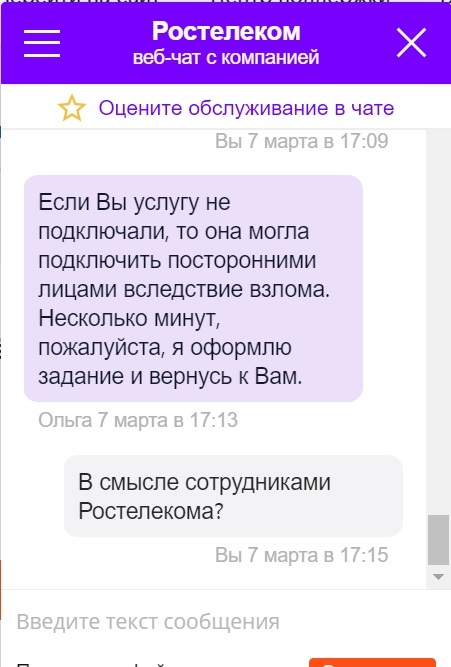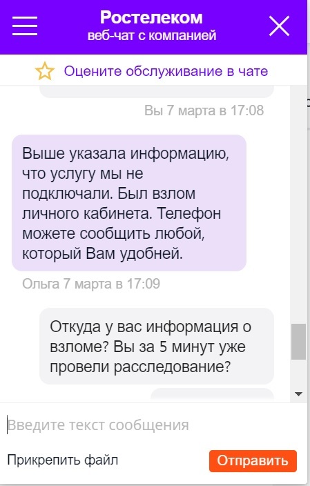 А вот тут сотрудница Ростелекома мне уже прямо говорит, что аккаунт взломан. То есть не предположения, а твёрдая уверенность.