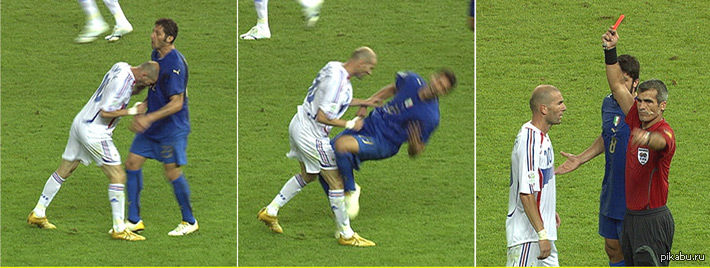 1710 Ig0r Ровно 9 лет назад 10 лет назад На 109-й минуте финала чемпионата мира 2006 года Зинедин Зидан ударил Марко Матерацци головой в грудь, за что был немедленно удалён с поля Футбол Зинедин Зидан Матерацци Чемпионат мира