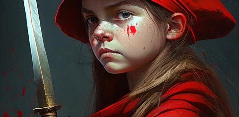 По дороге в лесу Красная Шапочка таки встречает волка и растерзал бы он ее, но тут на счастье под ближайшим кустом лежит меч.