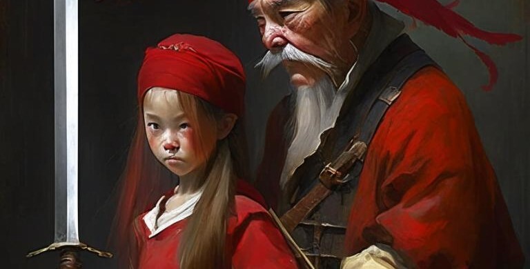 На фоне заходящего солнца две фигуры сражаются на мечах. Это дедушка учит внучку древнему искусству.
