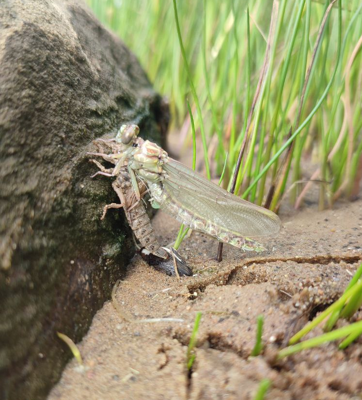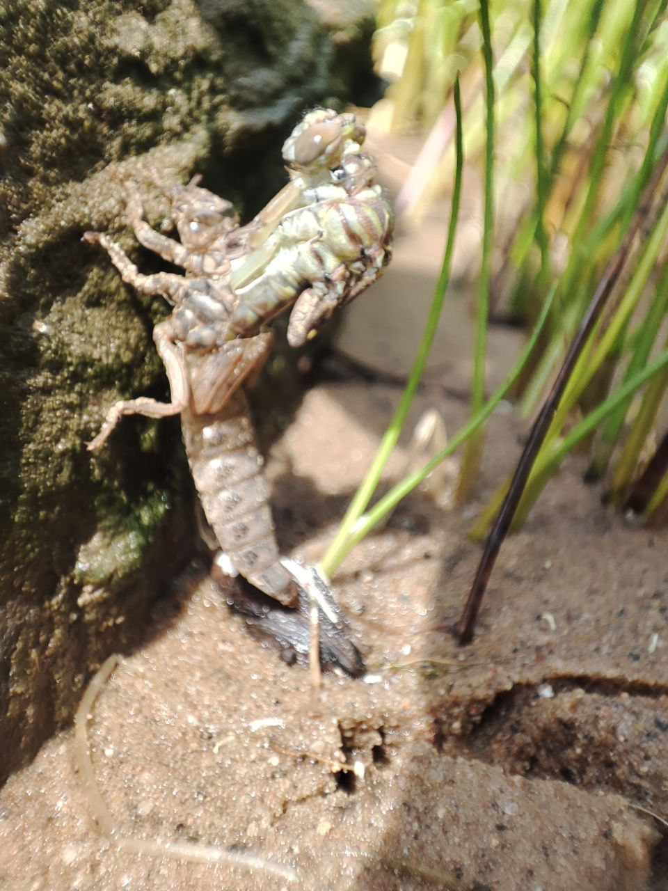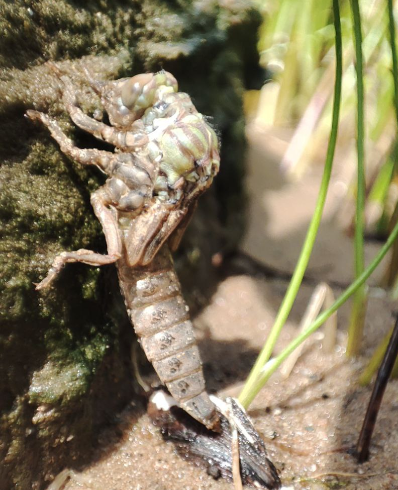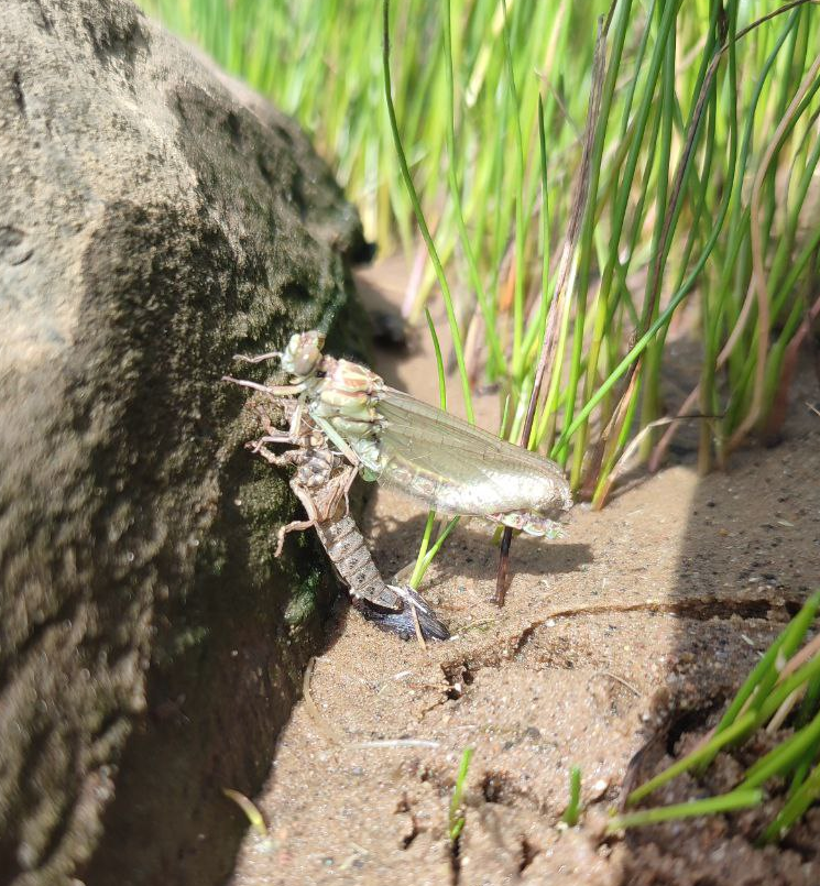 Забралось в полутень, закрепилось на камне. Стало дергать брюшком и подергиваться вправо-влево. А после голова с глазами и спина вскрылись, и стрекоза аккуратно начала выбираться из старой шкуры водоплавающего.