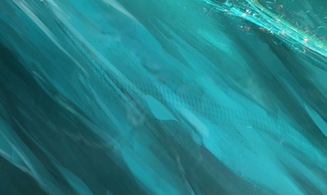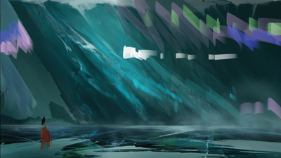 От этой работы остался скетч, где ещё видна подложка под ледник и лёд на поверхности воды. Скетч такого уровня получился за 2,5 часа, а дальше ковыряла детали ещё два дня.
