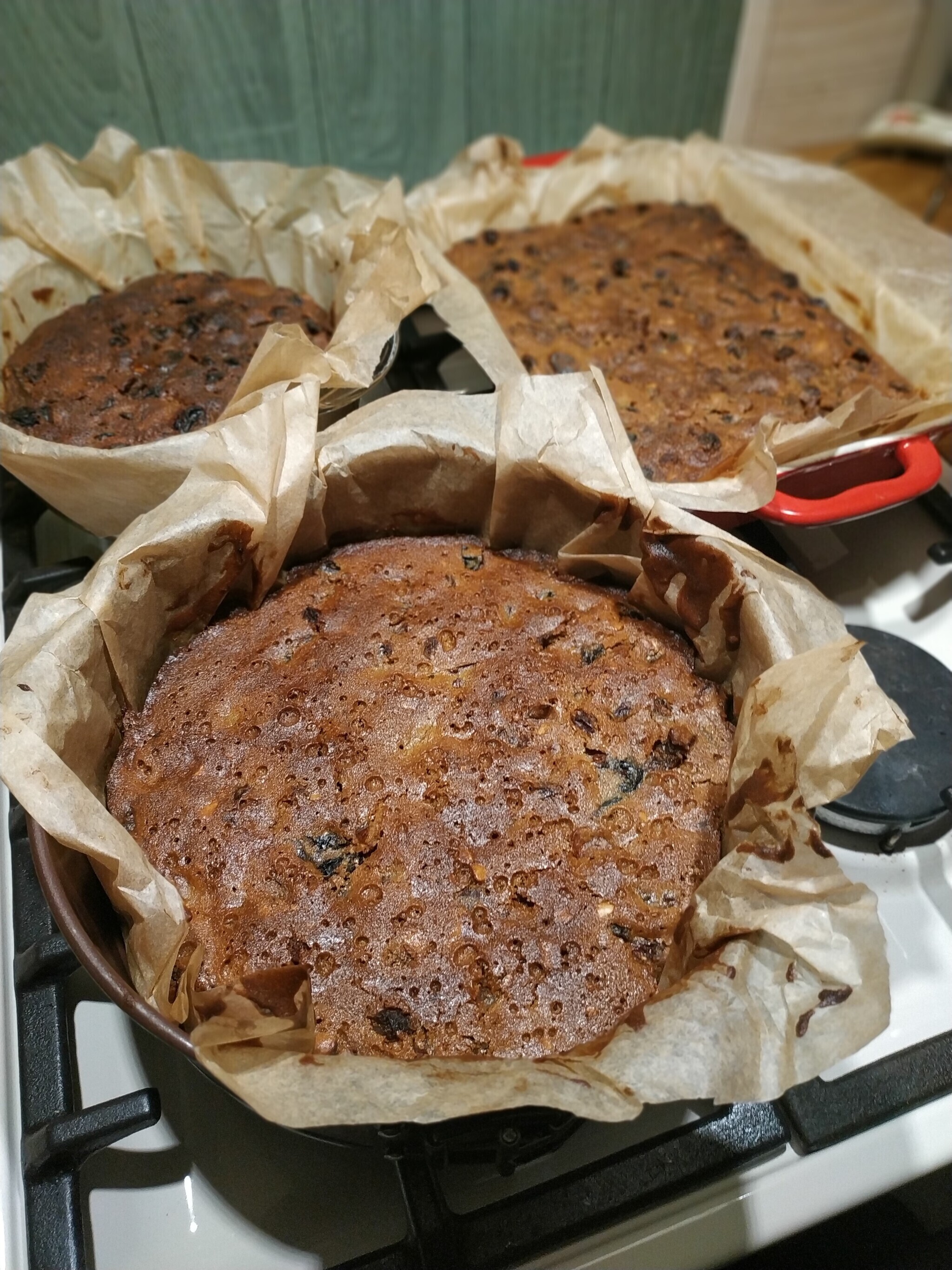 - Берем три формы, распределяем тесто - этого количества хватает на три кекса весом примерно 920 г (плюс-минус). Говорят, можно забубенить один кекс на почти три кило - но тогда и печь его надо будет часа четыре. Запихиваем формы в духовку на 140 градусов, часа на два. Проверяем готовность зубочисткой, если внутри еще не готово, а верх зарумянился - накрываем фольгой.