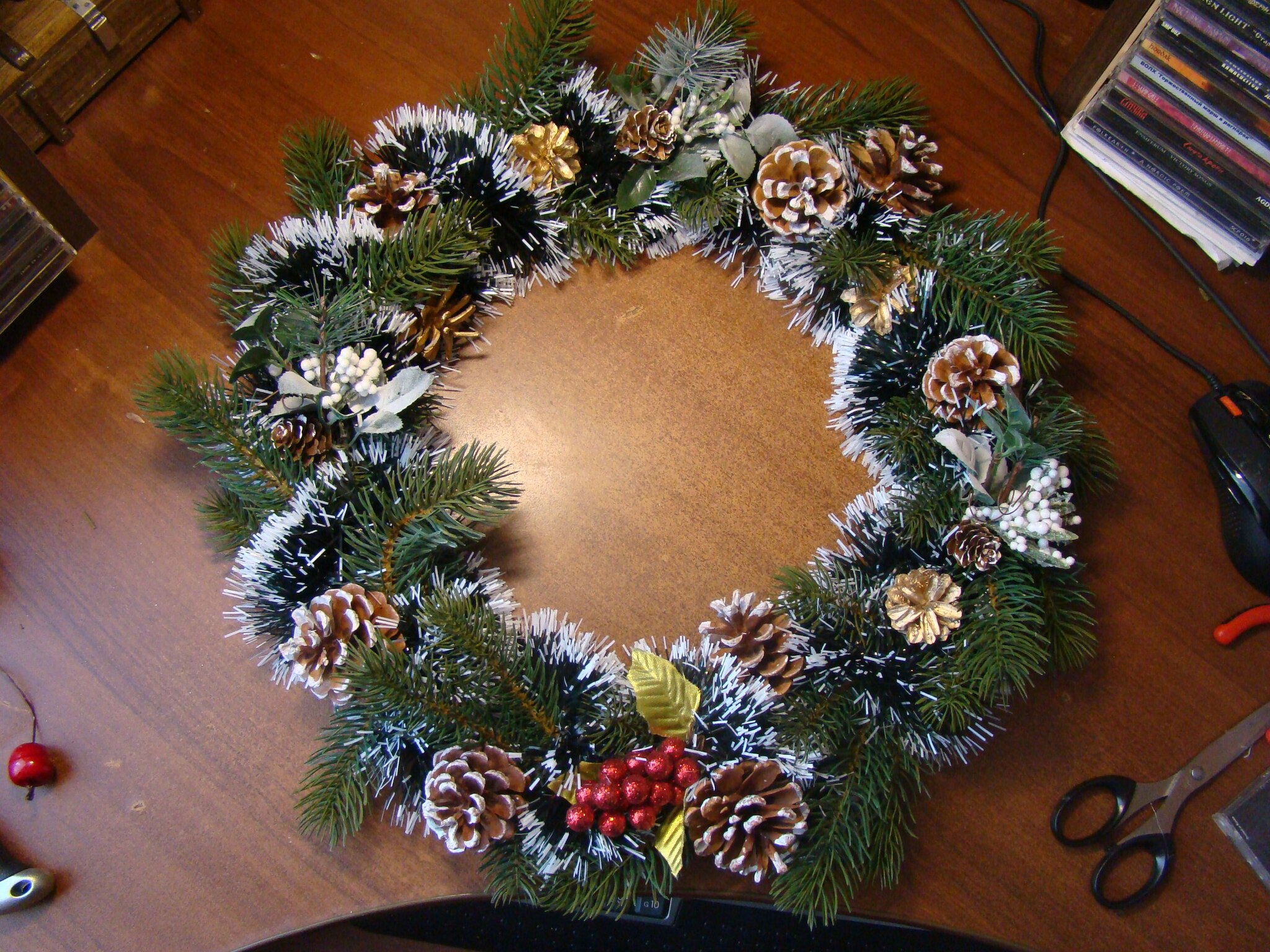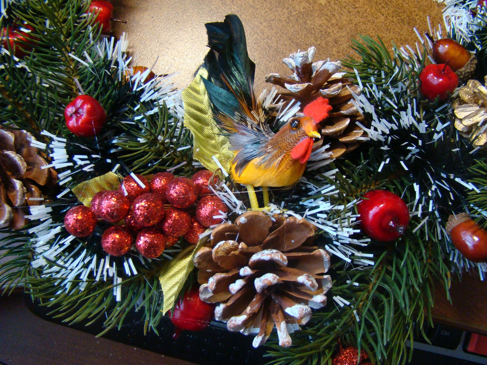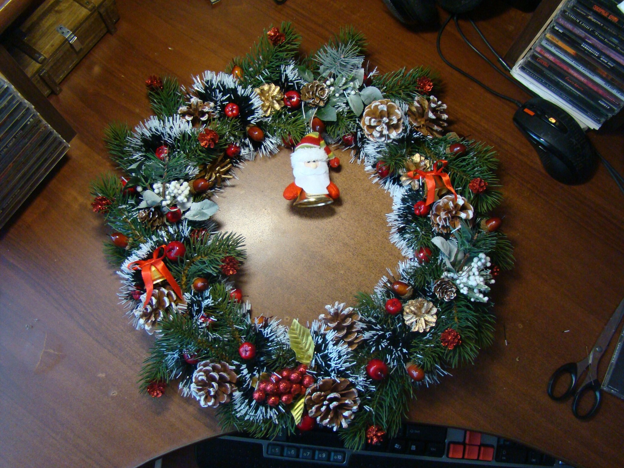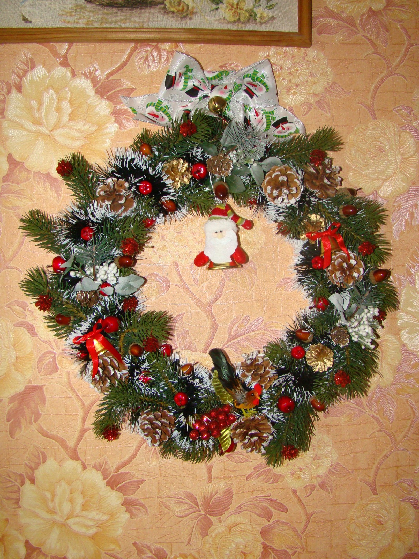 И результат. Этот венок живёт и служит уже побольше десятка лет и меняется на нём лишь символ грядущего года, что логично. Недавно ещё попытался "модернизировать" - обмотал тоненькой светодиодной гирляндой на батарейках, что добавило атмосферности.