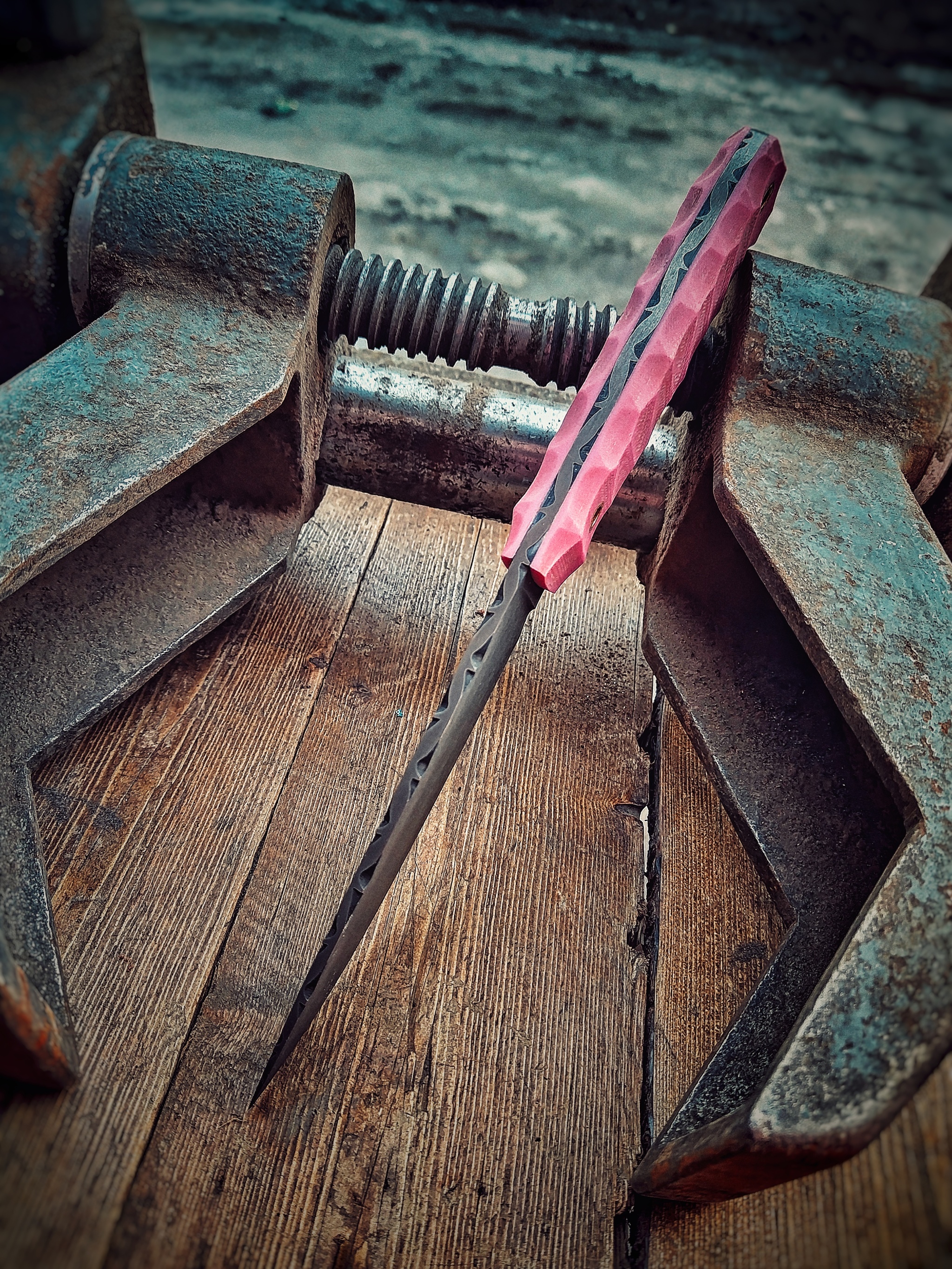 Общие габариты 250, клин 135х35х3,5, рукоять G10, мозаичные пины, травление.
