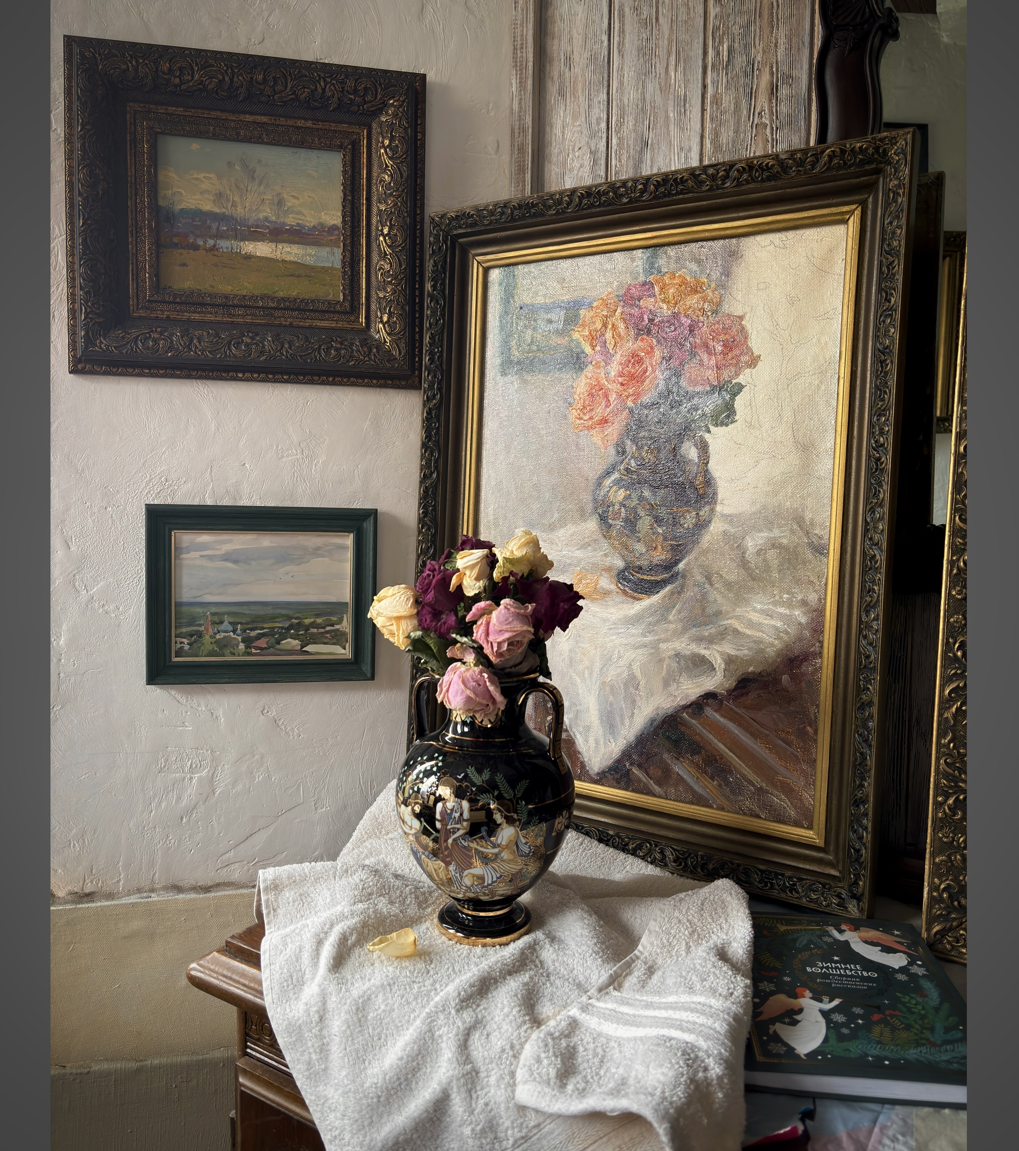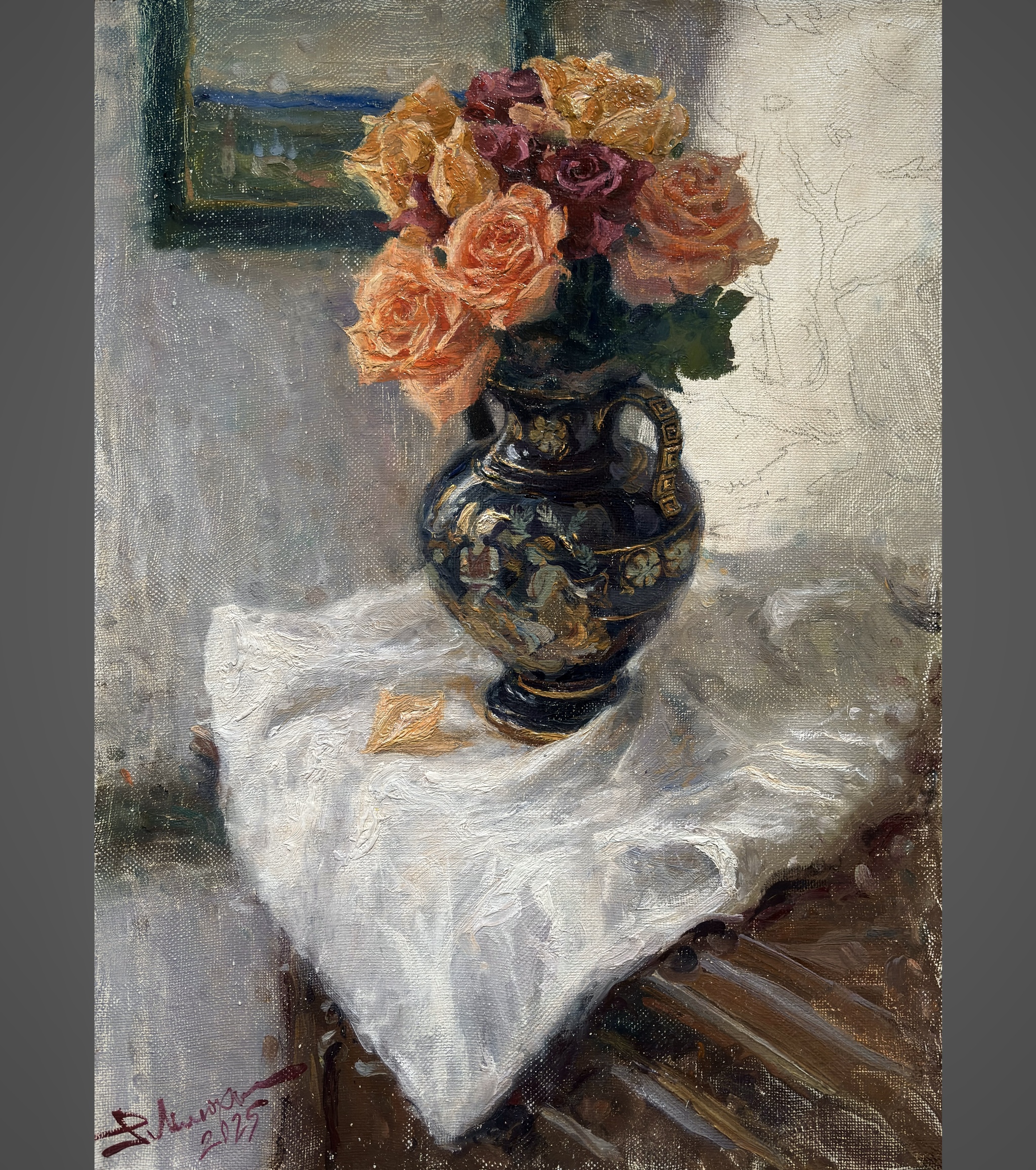 «Розы в греческой вазе» 2025. 60х46 см. Холст. Масло