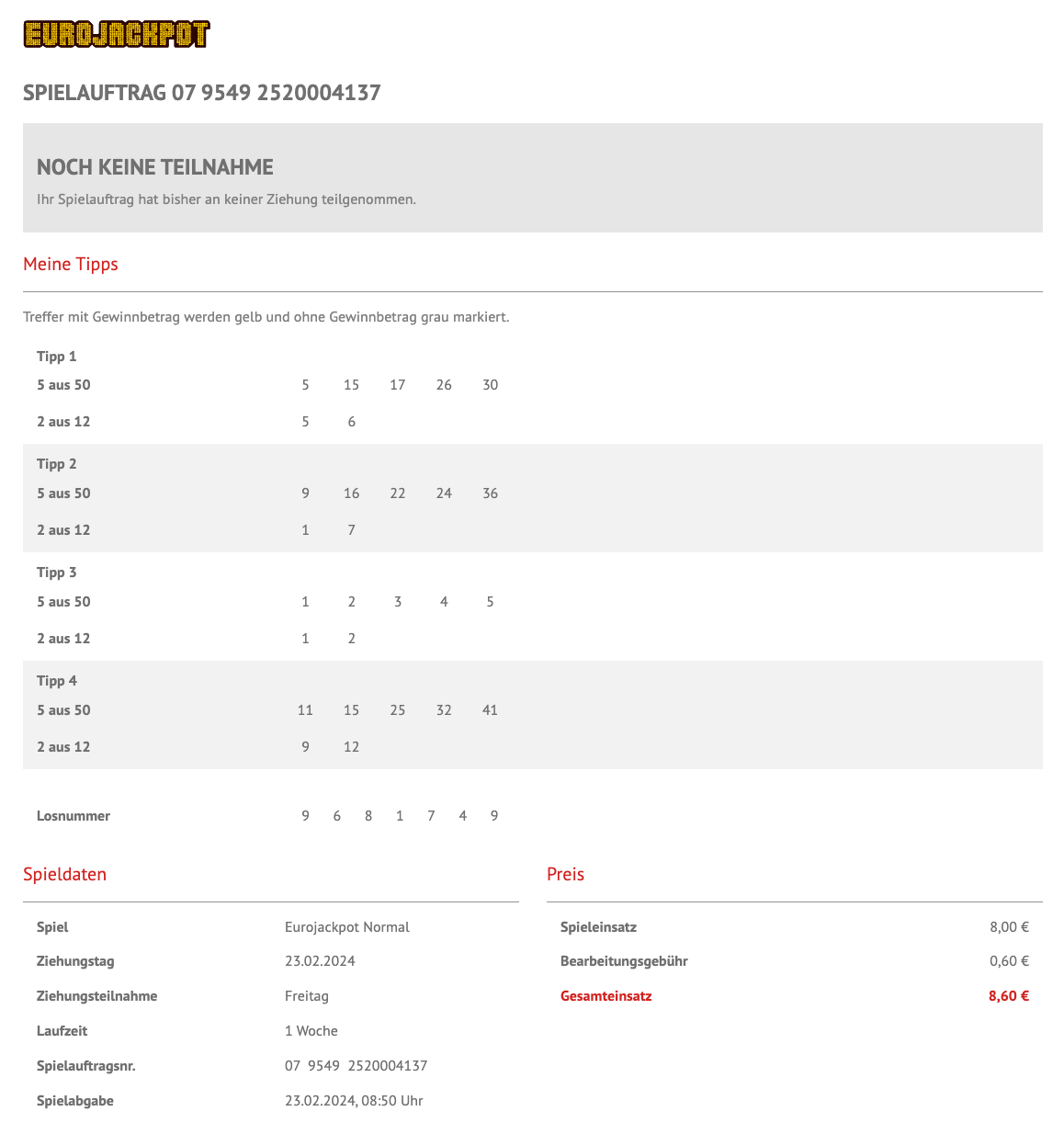Четвертый розыгрыш. За 4 игры мы выиграли только 8,6 Евро что доказывает что выигрыш редок и случаен в лотерее. Но мы продолжаем искать человека с прокачанным уровнем удачи. Он же должен быть среди нас, да?