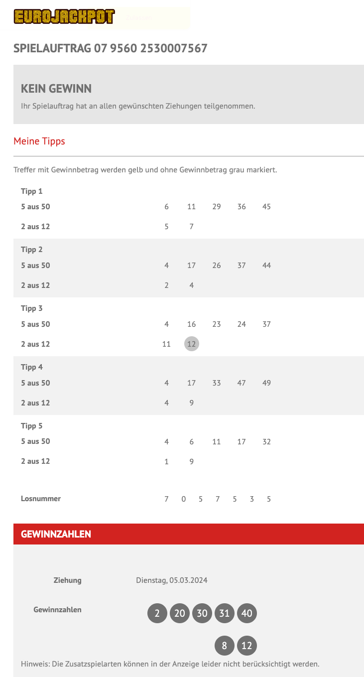 Было не удивительно, что мы угадали лишь 1 число на все 5 ставок, так как удивительным образом все комбинации были похожи друг на друга. Второй факт который впечатлил меня в этом розыгрыше - выпавшие числа. Ряд чисел был довольно странный и редкий, как раз на случай когда человек ставит от балды одинаковые числа. И такой человек был - он выиграл 1млн евро с чемто, поздравим его где бы он ни был на этой планете. Хоть комуто повезло.