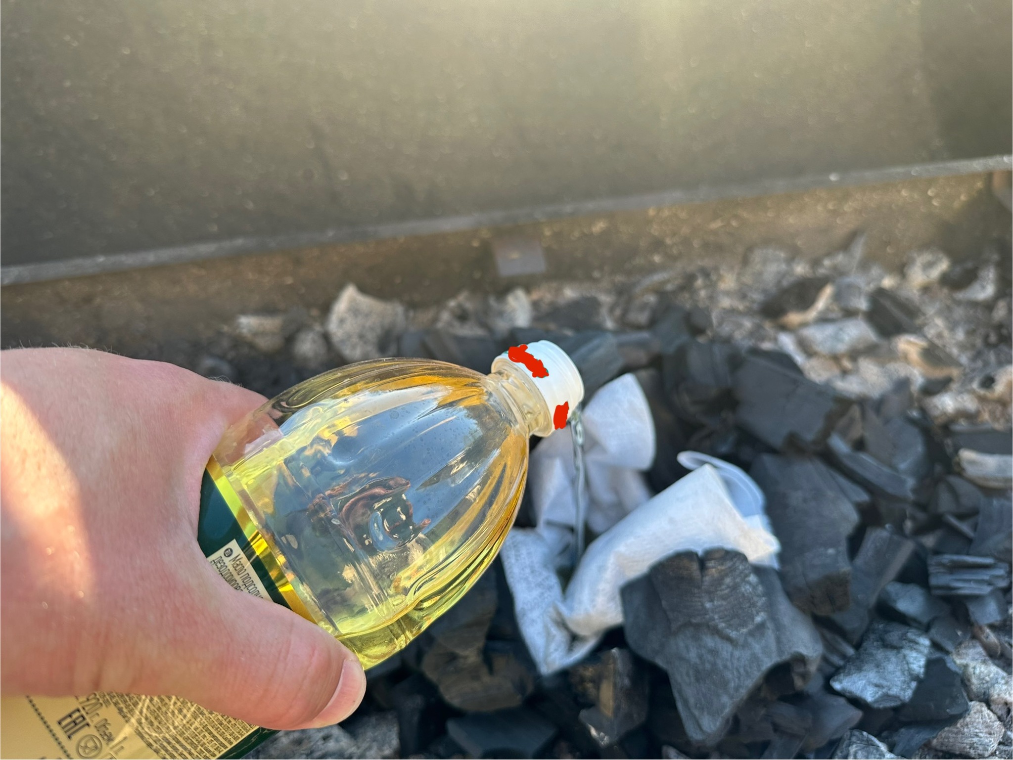 Берем обычное подсолнечное масло , разгребаем свежие насыпанные угли, делаем углубление салфеткой или бумажным полотенцем, оставляя их в углублении «кульком». Дальше наливаем в эту салфетку масла , не много , грамм 50 примерно. После чего поджигаем салфетку. На угли лить масло не надо! Салфетка загорается, доходит до масла и горит по смыслу как фитиль в свече. В процессе практически нет запаха, немного пахнет маслом , но даже аппетитно. Угли вокруг разгораются быстро. Способ дешевый и очень удобный. Работает и зимой и летом. Гораздо эффективнее бутылки вонючего розжига на угли.