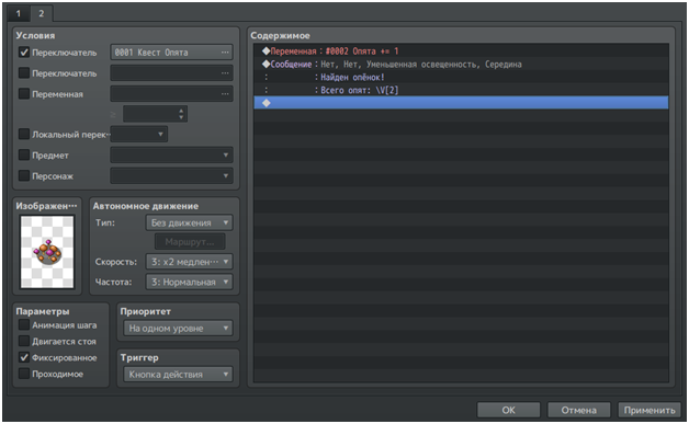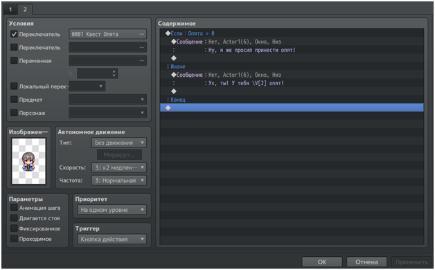 Обратите внимание, что я использую отдельный переключатель для ее квеста (его я включаю на странице 1, как в предыдущих примерах) – так проще разбираться в том, какой и для чего в игре служит, чем вешать кучу событий в зависимость от одного переключателя. Но, бывает и обратная ситуация, например, когда вы реализуете смену дня и ночи, в этом случае можно ночные события поставить в зависимость от одного переключателя. Короче, это штука ситуативная, но все-таки, по возможности, лучше разделять.