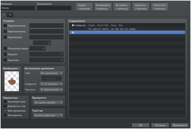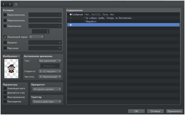 Можно, конечно, включать переключатель Сбор Опят у ведьмы, но зачем? Это будет не совсем правильно – игрок же не общался с Любителем Опят. Поэтому просто скопируем страницу 2 ивента Опёнок и в копии поставим условием переключатель Сбор грибов.