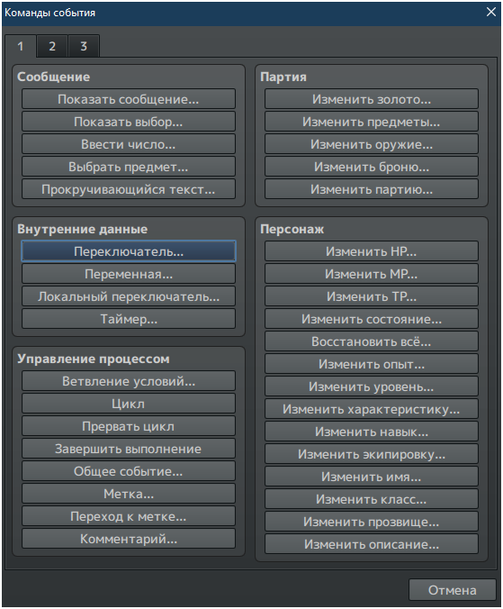 Локальные переключатели служат для ручного переключения страниц внутри ивента. Всего их 4 – A,B,C и D. Локальный переключатель А(например) использованный в одном ивенте, не имеет ничего общего с локальным переключателем А в ивенте другом.