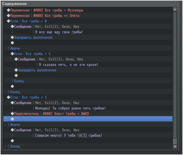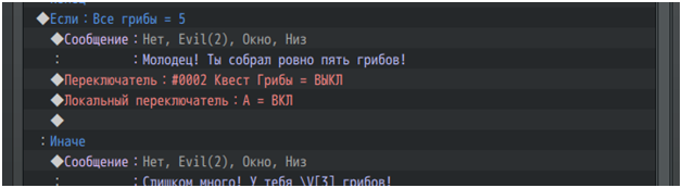Ну, с ее страницами все понятно – уже два раза показывал, повторяем то же самое. Как вы догадываетесь, квест будет завершаться командой выключения переключателя. Ее нужно вставить после сообщения «Ты собрал пять грибов!» - это и будет точка окончания квеста.