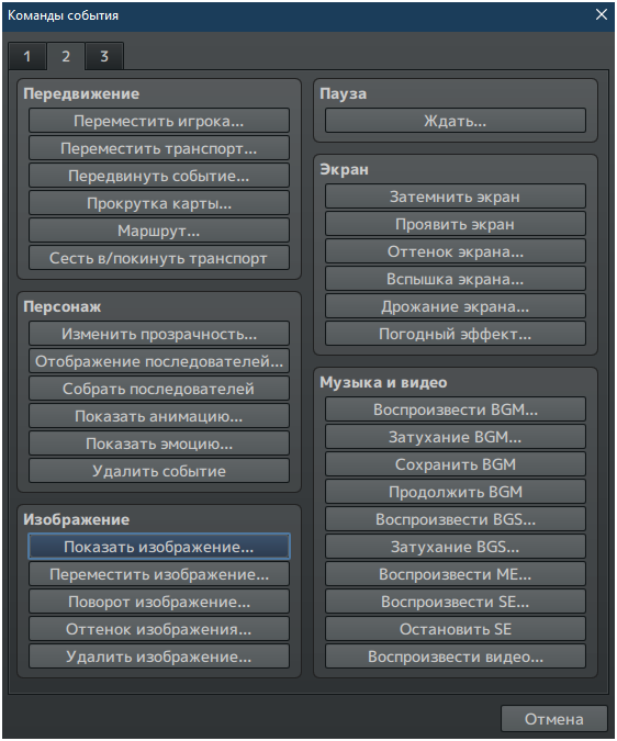 Поле «Изображение» находится на второй странице списка команд ивента и содержит в себе пять этих самых команд: