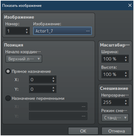 «Показать изображение» - выводит на экран любую картинку в формате png (мукер работает только с такими) согласно координатам заданным в поле «Позиция». Координаты могут быть заданы как вручную, так и взяты из переменных. Координатная сетка задана в пикселях относительно выбранного размера окна игры, а не карты, где нулевой точкой будет верхний левый угол. Положительные значения оси Х расположены справа от нуля, а положительные Y – ниже нуля. Т.е., как и в случае с тайловой сеткой, мы имеем «перевернутую» ось Y.