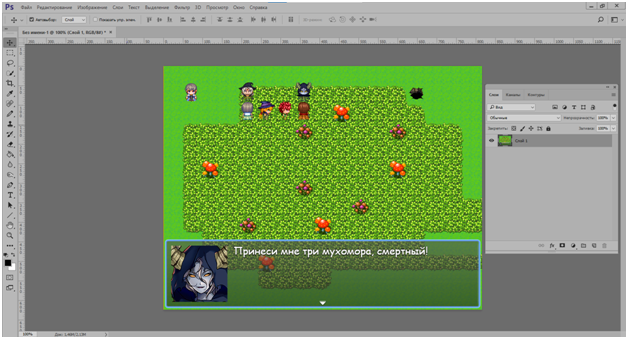 А теперь просто скрываем нижний слой со скрином (нажать на иконку глаза в списке слоев, список вызывается нажатием на F7) и сохраняем в Папка Проекта-> img -> pictures, можно даже прямо с заменой исходного Actor1_7, только соседнюю вкладку с этой картинкой в ФШ закройте, а то он ругаться будет.
