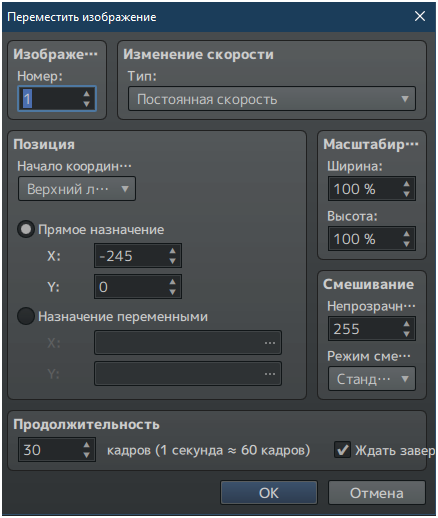 Здесь имеется возможность выбрать номер изображения, которое мы хотим переместить и задать координаты конечной точки перемещения. Да, переместить на сколько-то пикселей нельзя, можно лишь указать конечную точку, координаты которой придется высчитывать. Неудобно, но что поделаешь.