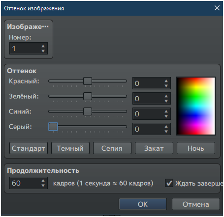 Здесь мы можем задать изображению оттенок, причем, как вручную, так и воспользовавшись пятью шаблонами. Предлагаю просто выкрутить на максимум ползунок «Серый», тем самым обесцветив изображение неактивного участника диалога. Продолжительность выставлю в 1 кадр, так как не хочу тратить время на этот эффект.